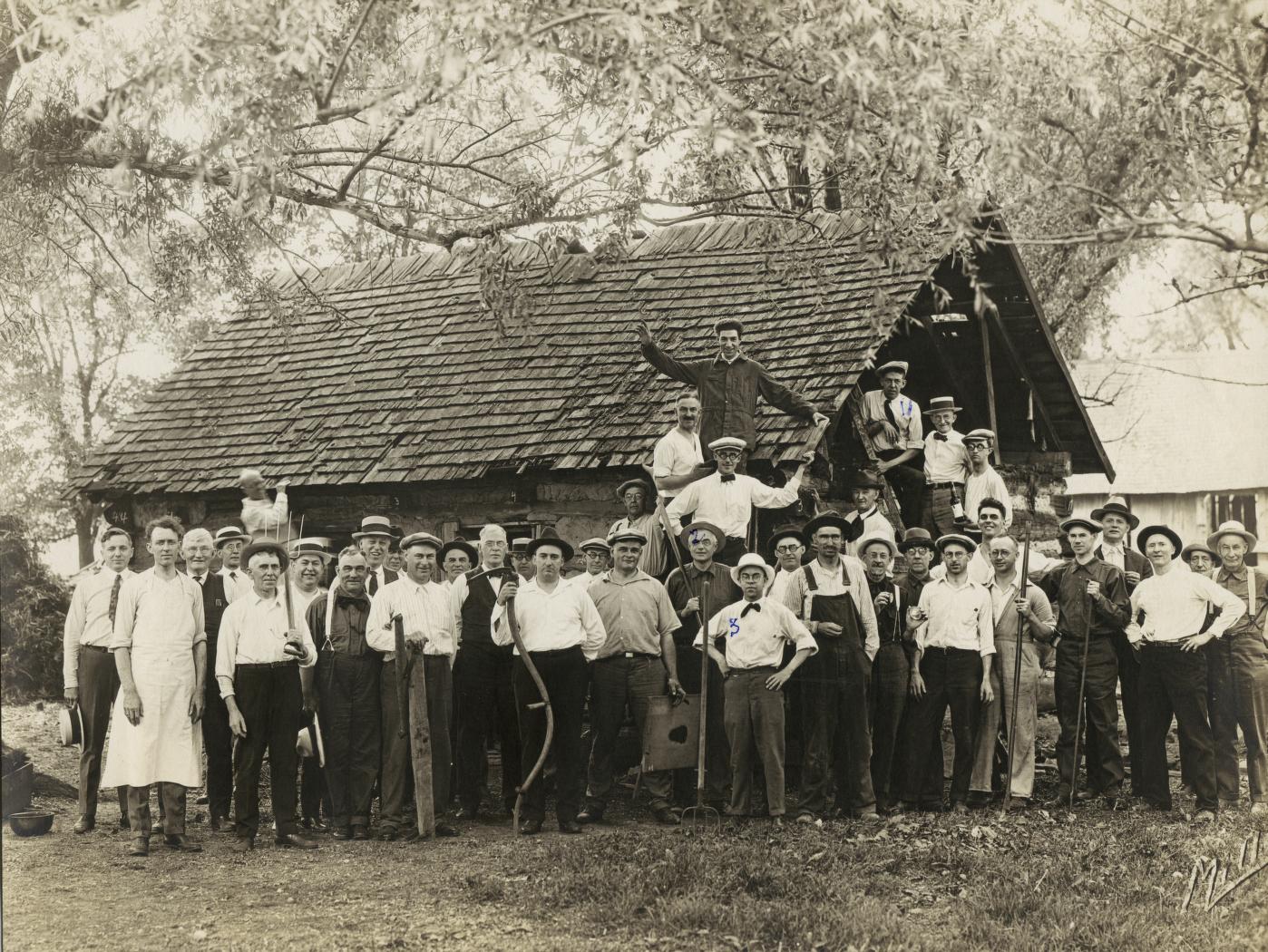 Kiwanis Club of Ypsilanti with Relocated Centennial Log Cabin, from 1923. Photo from the Ypsilanti Historical Society Archives.