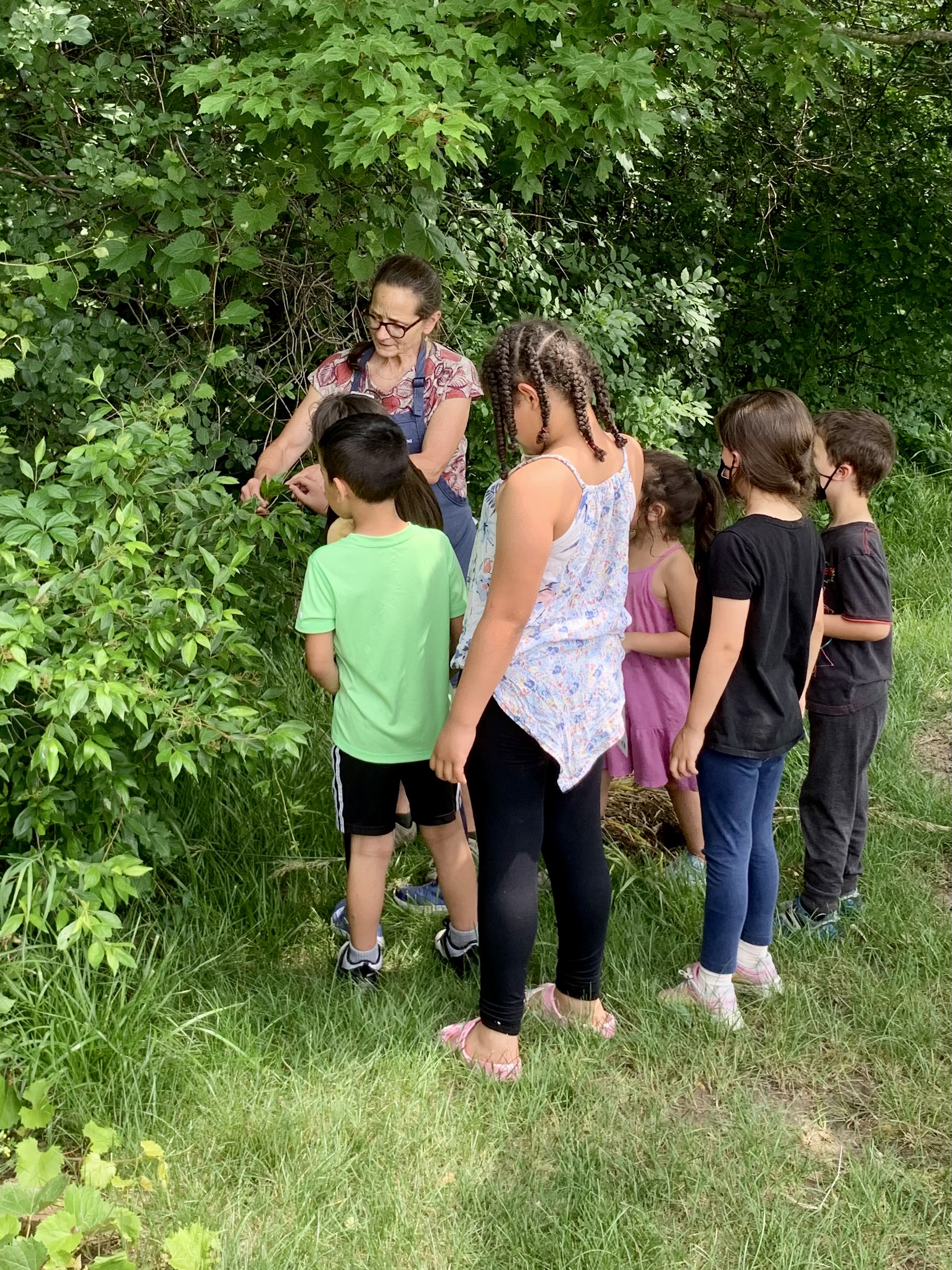 Elizabeth, from Matthaei, showing plants to kids during the garden walk.