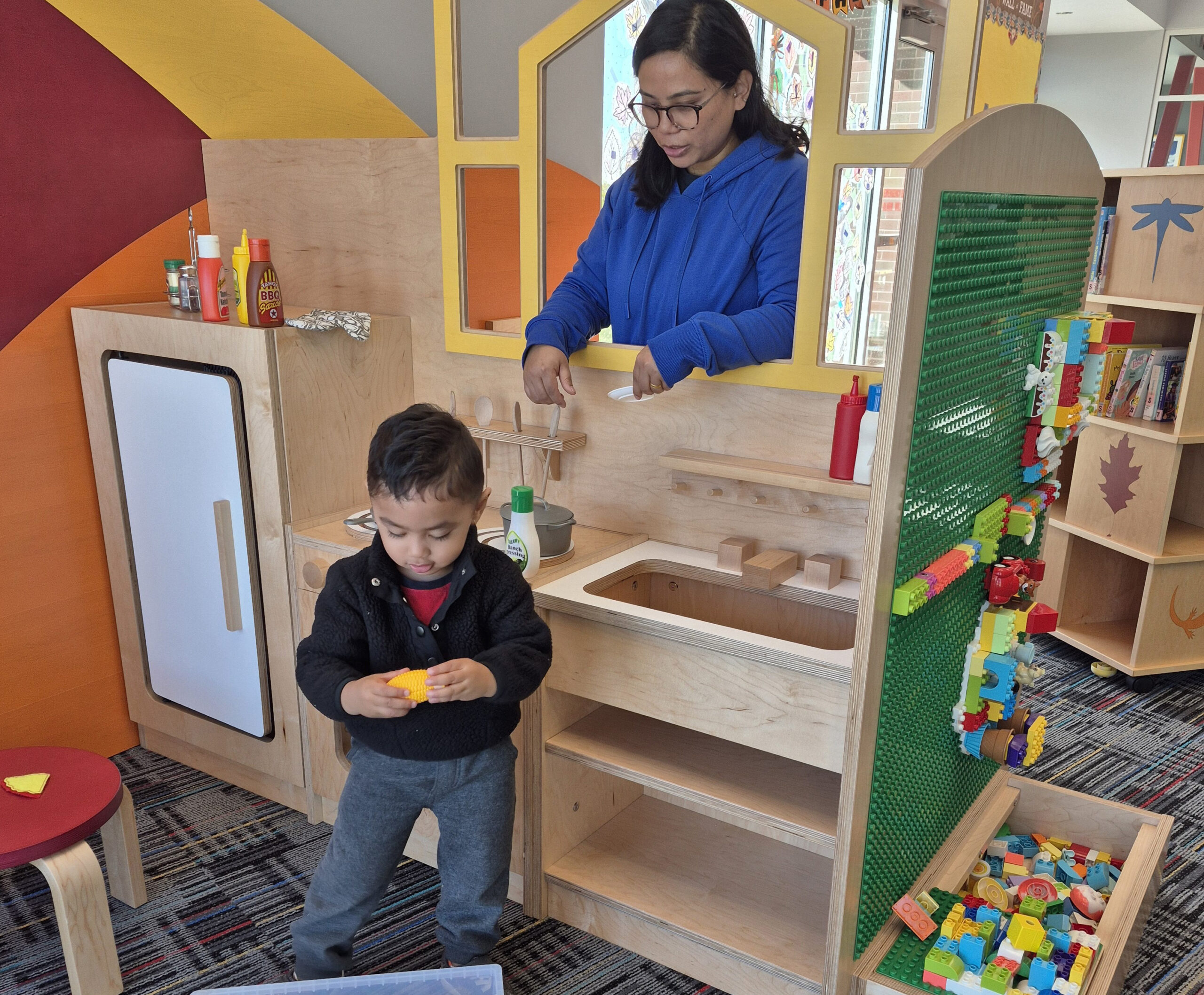 Stop by the library to play! Each of our locations has educational play spaces that are updated every three months. Play spaces are designed to help parents make learning fun. Enjoy pretend play, constructive play, and exploratory play every day!